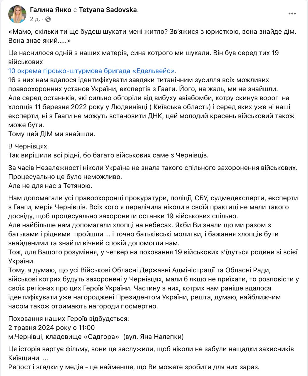 В Черновцах захоронили 16 военных, погибших в результате авианалета 11 марта 2022 года на Людвиновку Киевской области, сообщила адвокат семей погибших Галина Янко.