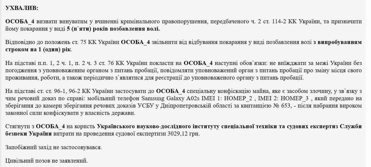 Также киевского охранника многоэтажки, предупреждавшего жильцов о визитах ТЦК, осудили на пять лет. Как гласит фабула дела, охранник дома написал по меньшей мере пять раз в домовой чат, где состоят 818 жильцов, сообщения: "адресная раздача повесток", "повестки адресно", "у нас опять ТЦК".