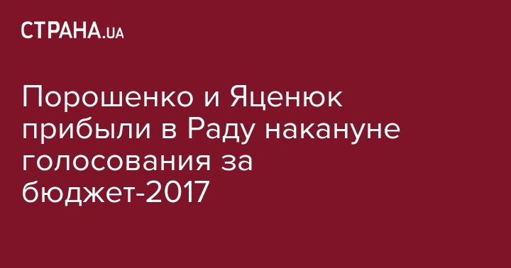 Президент Украины Петр Порошенко вместе с лидером партии "Народный фронт" Арсением Яценюком прибыли в Верховную Раду, где началось ночное заседание парламента на котором планируется поставить на голосование исправленный вариант проекта бюджета 2017, сообщает источник "Страны" во фракции БПП.
