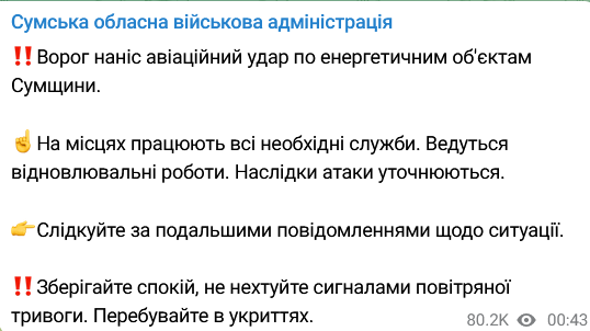 Ночью россияне нанесли авиаудар по энергетическим объектам Сумской области