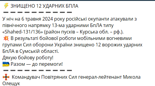 Судя по всему, речь идет о беспилотниках. Воздушные силы ВСУ уже заявили, что сбили 12 из 13 "Шахедов" на территории Сумской области.