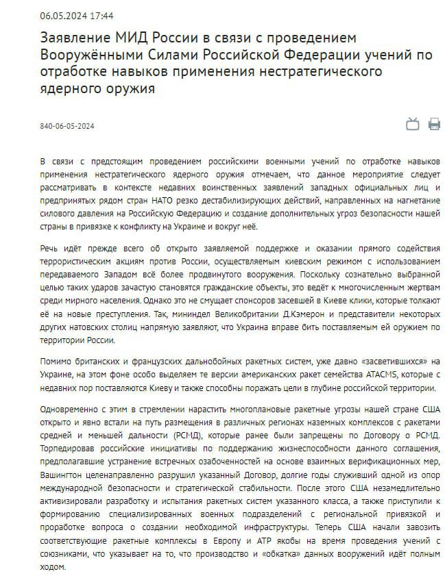 "Создаваемые таким образом военные опасности и вытекающие из них угрозы для нашей страны чётко обозначены в Военной доктрине РФ и Основах государственной политики Российской Федерации в области ядерного сдерживания (в документах описываются ситуации, при которых Россия может применить ядерное оружие - Ред.)... Рассчитываем, что данное мероприятие (ядерные учения - Ред.) остудит горячие головы в западных столицах, поможет осознать возможные катастрофические последствия генерируемых ими стратегических рисков, удержит их от втягивания в прямую вооружённую конфронтацию с Россией", - говорится в заявлении МИД.