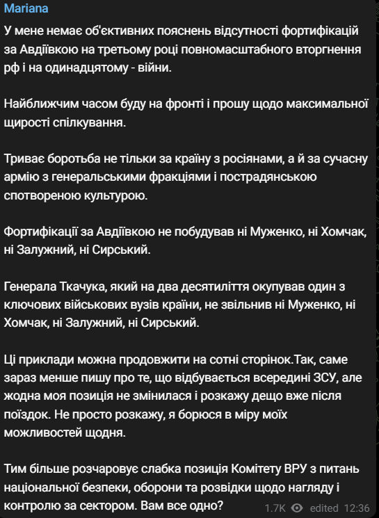 "У меня нет объективных объяснений отсутствия фортификаций за Авдеевкой на третьем году полномасштабного вторжения рф и на одиннадцатом - войны. Фортификации за Авдеевкой не построил ни Муженко, ни Хомчак, ни Залужный, ни Сырский", - пишет нардеп.