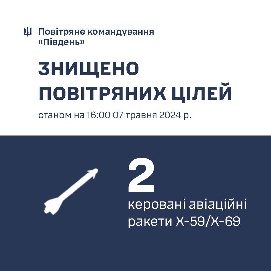 "7 мая 2024 года, около 14 часов, в Одесской области воинами зенитной ракетной Одесской бригады уничтожены 2 управляемые авиационные ракеты Х-59/Х-69", – говорится в сообщении.