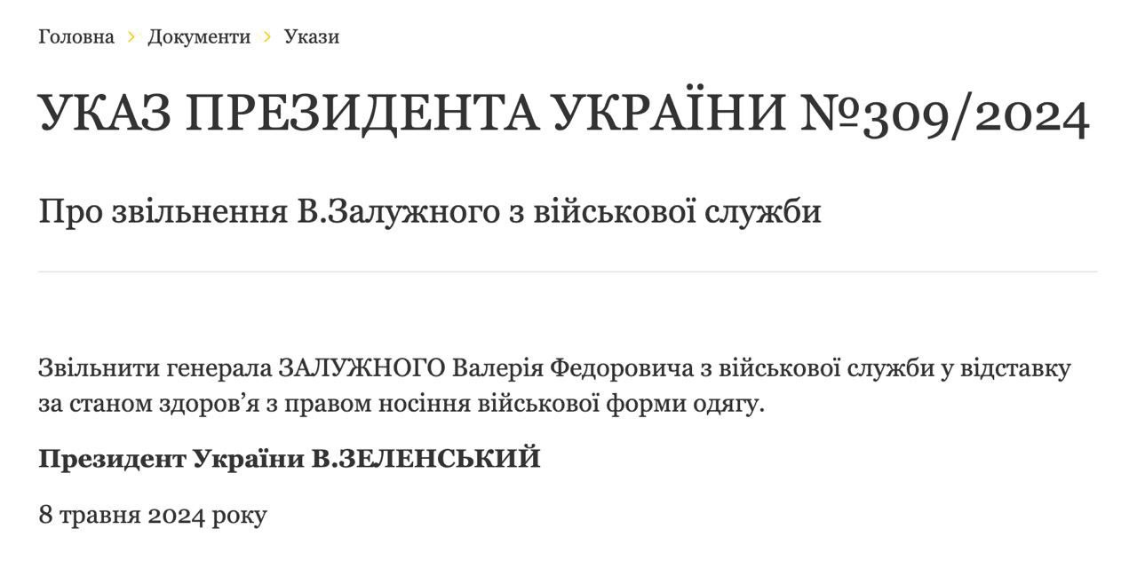 13.42 Залужного официально уволили с военной службы по состоянию здоровья.