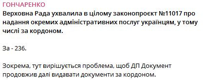 Об этом сообщает нардеп Алексей Гончаренко.