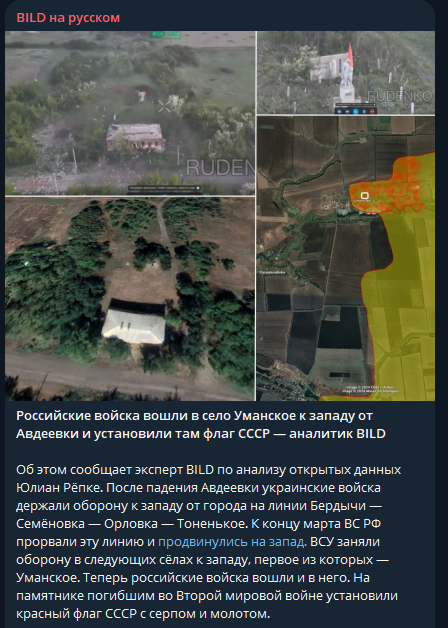 Военный аналитик немецкого издания Bild Юлиан Репке заявил, что российская армия вошла в село Уманское на Авдеевском направлении. Россияне водрузили флаг СССР на памятнике погибшим во Второй мировой войне в этом населенном пункте.