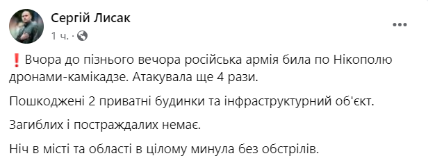"Повреждены 2 частных дома и инфраструктурный объект. Погибших и потерпевших нет. Ночь в городе и области прошла без обстрелов", - написал он.