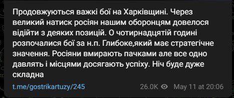 "Продолжаются тяжелые бои в Харьковской области. Из-за большого давления россиян нашим защитникам пришлось отойти с некоторых позиций. В четырнадцать часов начались бои за населенный пункт Глубокое, имеющее стратегическое значение. Россияне умирают пачками, но все равно давят и местами преуспевают. Ночь будет очень сложная", - говорится в телеграм-канале подразделения.