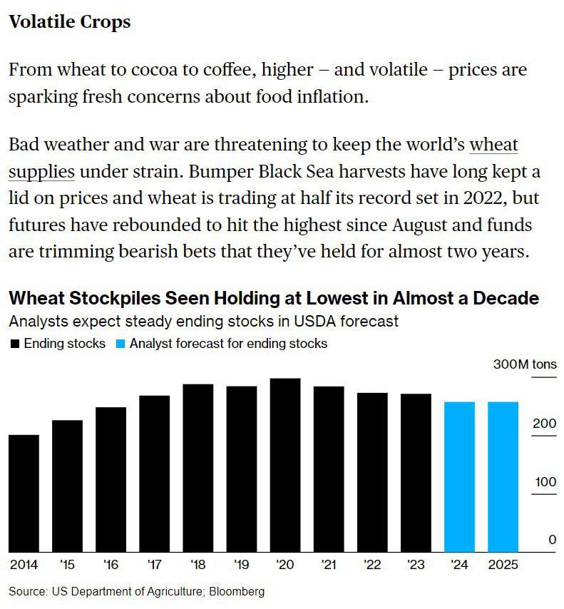 Очень хорошие урожаи в странах черноморского бассейна (в первую очередь, в Украине и в России) долгое время сдерживали мировые цены. И стоимость пшеницы оставалась вдвое ниже рекорда, установленного в 2022 году. Но сейчас фьючерсы достигли максимума с августа, сообщает Bloomberg.