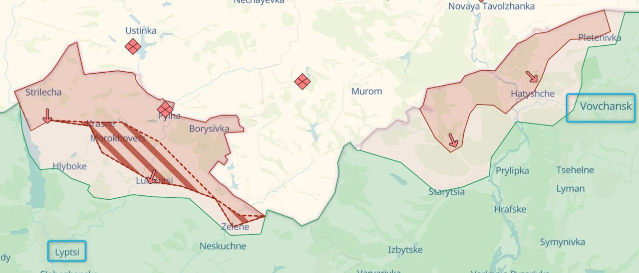 На том же участке продолжаются бои за Лукьянцы, которые "почти полностью" захвачены. Также россияне пытаются закрепиться в селе Глубокое, но там их позиции усложняют дроны ВСУ.