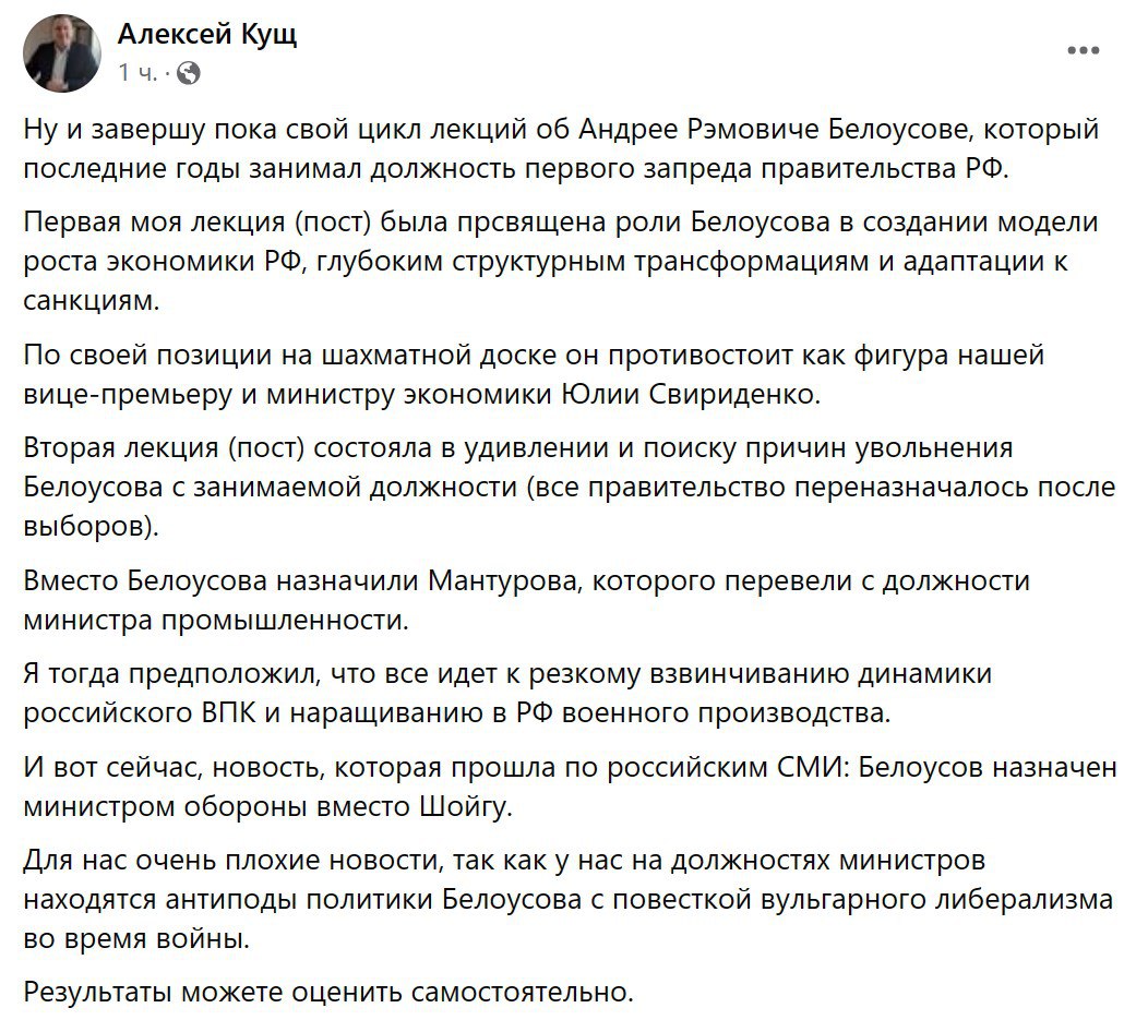 Кущ считает, что Белоусов сыграл роль "в создании модели роста экономики РФ, глубоких структурных трансформациях и адаптации к санкциям".