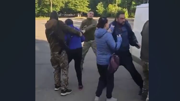 Появилось видео, как женщины отбили у военкомов мужчину, которого силой запаковали в бус под Харьковом