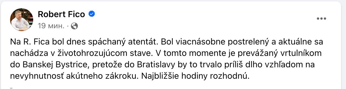 На странице Фицо в Фейсбуке официально заявили, что он находится "в опасном для жизни состоянии" и "получил множественные ранения".