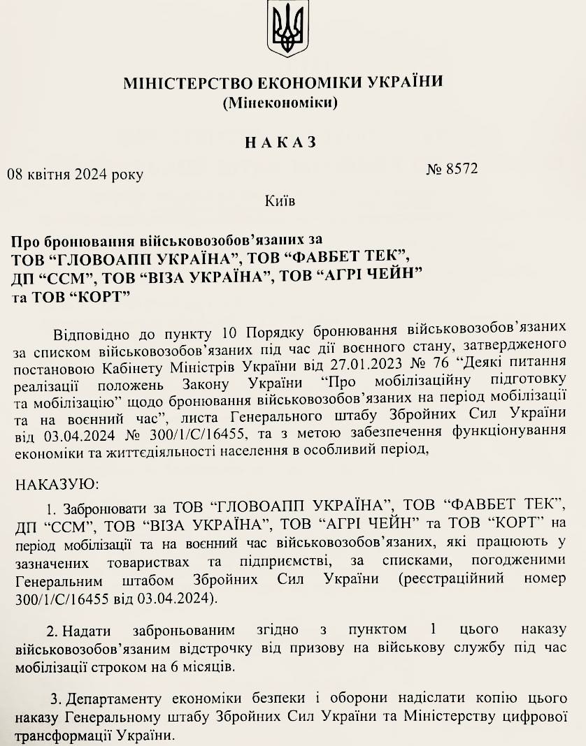 "Указанные компании обратились в профильное Министерство цифровой трансформации. Министерство цифровой трансформации признало их критически важным на основании трех из семи критериев: отсутствие задолженности по ЕСВ, уровень зарплаты и то, что они являются резидентами Дии. После этого Минцифры отправило списки военнообязанных в Генштаб для проверки. На основе решения Генштаба списки прорабатываются министерством экономики. В случае отсутствия правовых оснований для отказа принимается решение о бронировании работников", - сказала Свириденко.