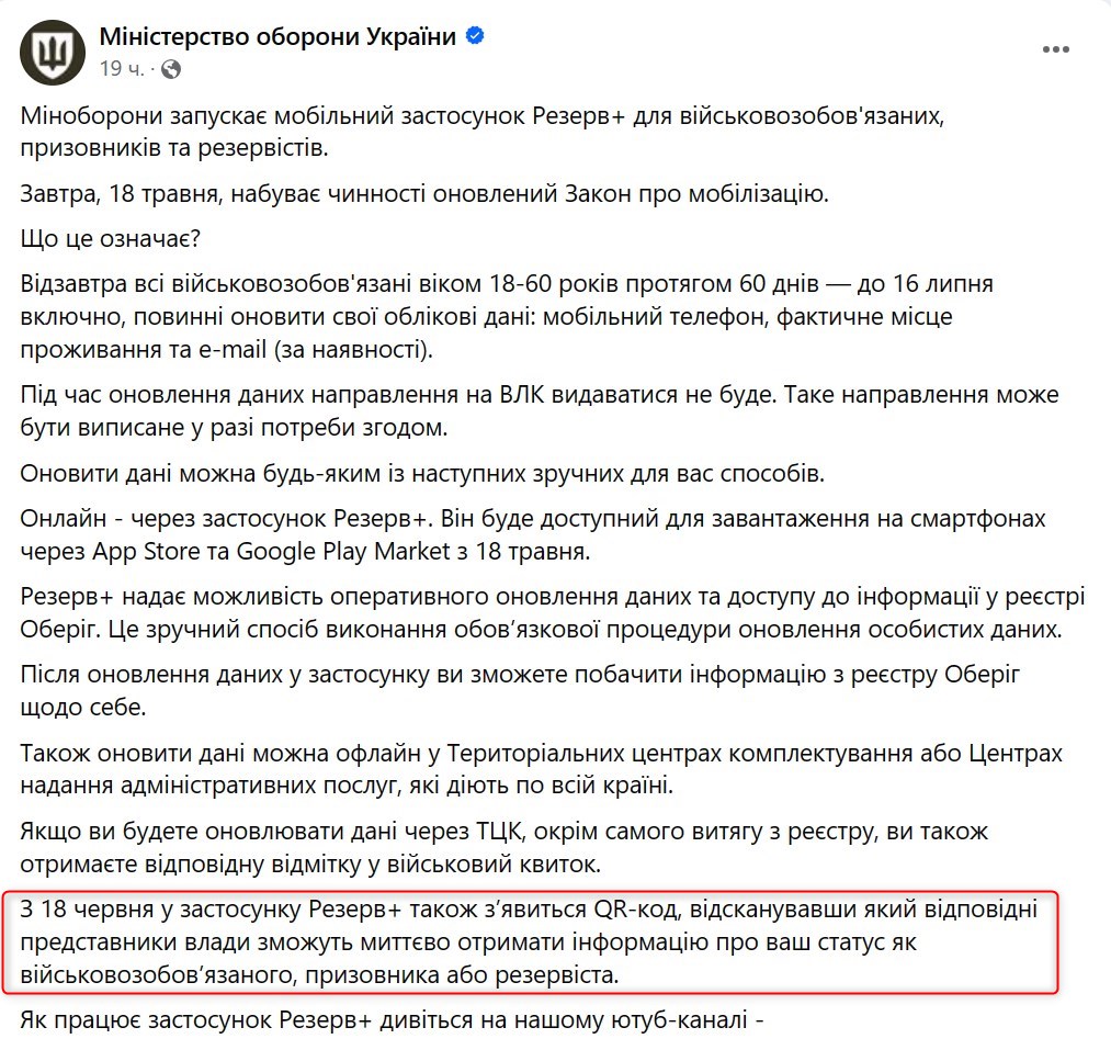 "С 18 июня в приложении Резерв+ также появится QR-код, отсканировав который соответствующие власти смогут мгновенно получить информацию о вашем статусе как военнообязанного, призывника или резервиста", - говорится в сообщении МО.