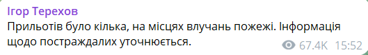 "Прилетов было несколько, на местах попадания пожары. Информация о пострадавших уточняется", - написал он.