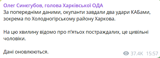 Глава Харьковской ОВА Олег Синегубов сообщил, что по предварительным данным, оккупанты нанесли два удара КАБами, в частности по Холодногорскому району Харькова.