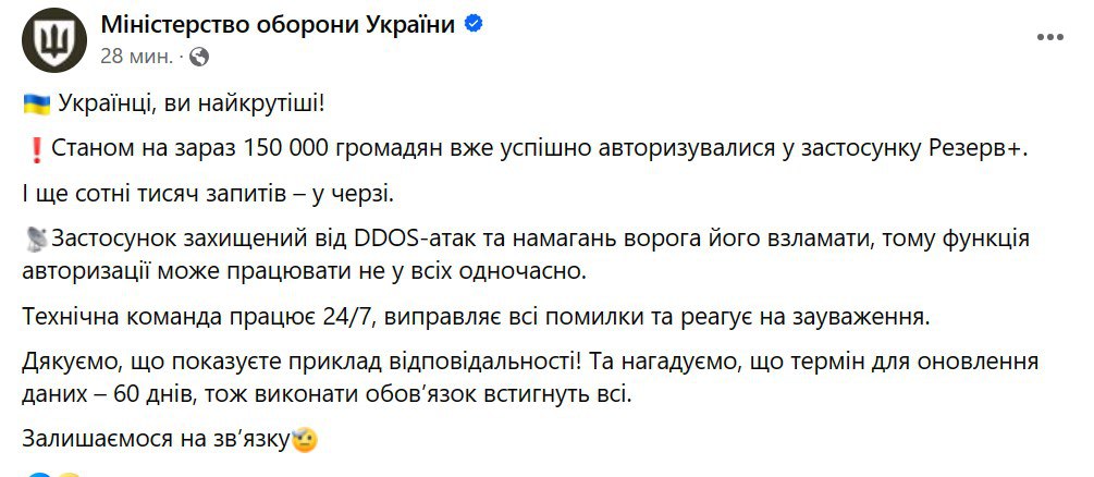 "Приложение защищено от DDOS-атак и попыток врага его взломать, поэтому функция авторизации может работать не у всех одновременно", - пояснило ведомство в Фейсбуке.