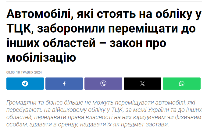 Перемещать автомобили, стоящие на учете в ТЦК, в другие области или продавать их запрещено. Причем, независимо от пола и возраста владельца автомобиля - транспортной повинности подлежат все украинцы (не только военнообязанные).