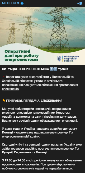 В субботу, 18 мая, во всех регионах Украины с 19:00 до 24:00 планируют ввести ограничения промышленных потребителей, для населения ограничений не предвидится.