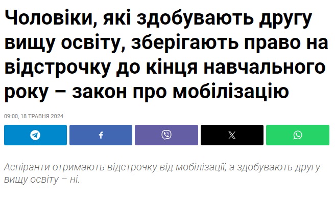 "Переходные положения закона о мобилизации № 10449 предусматривают, что граждане Украины, которые учатся в учебных заведениях и имели право на отсрочку на время обучения, в случае утраты этого права в соответствии со статьей 23 закона "О мобилизационной подготовке и мобилизации" сохраняют такое право до завершения текущего учебного года", - пишет издание.
