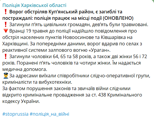 "Утром 19 мая в полицию поступило сообщение об обстреле населенных пунктов Новоосиново и Ковшаровка в Харьковской области. По предварительным данным, враг ударил по селам из реактивной системы залпового огня "Ураган" - говорится в сообщении.