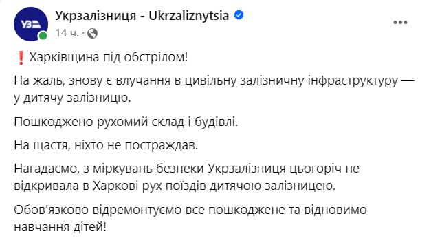 Последствия обстрела детской железной дороги в Харькове. Фото: Укрзализныця