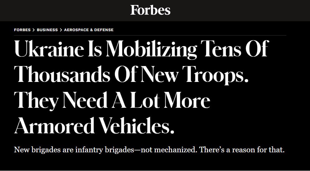 Издание отмечает, что нехватка тяжелой техники настолько острая, что недавно сформированная 153-я бригада фактически превратилась из механизированного формирование в пехотное (153 ОПБр).