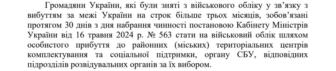 В нем сказано, что мужчины за границей подлежат военному учету на тех же началах, что и мужчины в Украине. И у них есть 30 дней со дня вступления в силу постановления правительства от 16 июня, чтобы явиться в ТЦК.