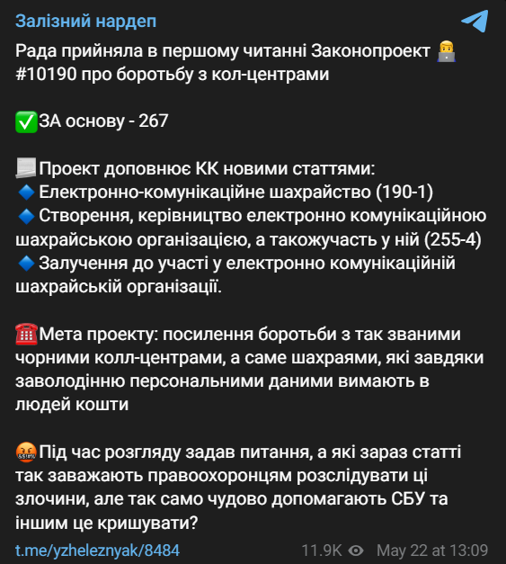 Верховная Рада приняла в первом чтении законопроект об усилении борьбы с мошенническими колл-центрами. За основу соответствующего законопроекта проголосовали 267 депутатов.