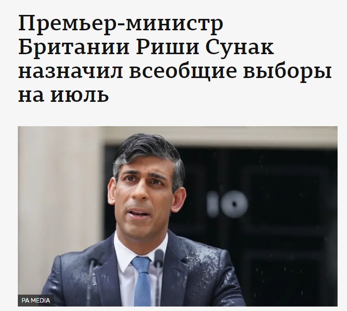 "Ранее сегодня я говорил с его величеством, чтобы попросить о роспуске парламента. Король удовлетворил эту просьбу, и 4 июля состоятся всеобщие выборы", — сказал премьер журналистам у входа в резиденцию на Даунинг-стрит.