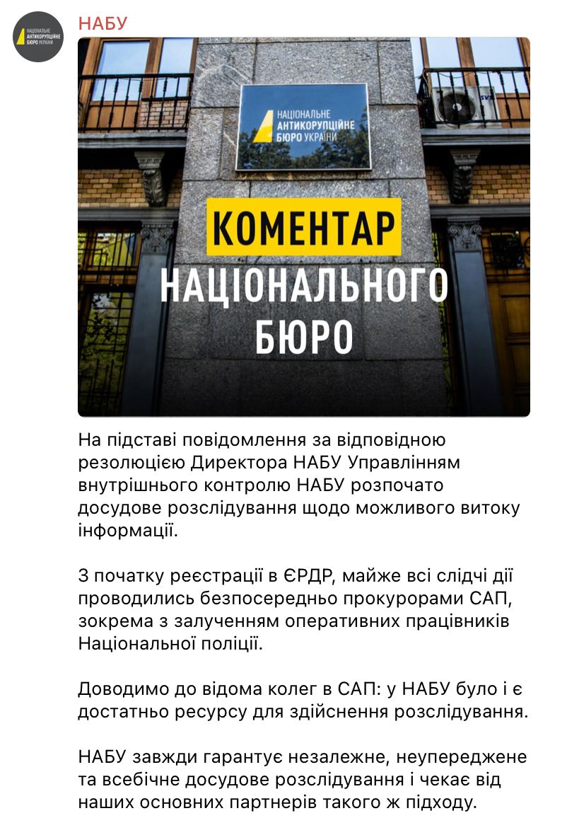 Между Национальным антикоррупционным бюро Украины (НАБУ) и Специализированной антикоррупционной прокуратурой (САП), похоже, начинается публичный конфликт. НАБУ официально подтвердило расследование по возможной утечке информации.