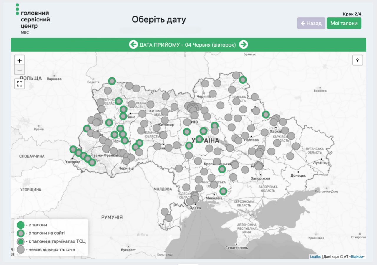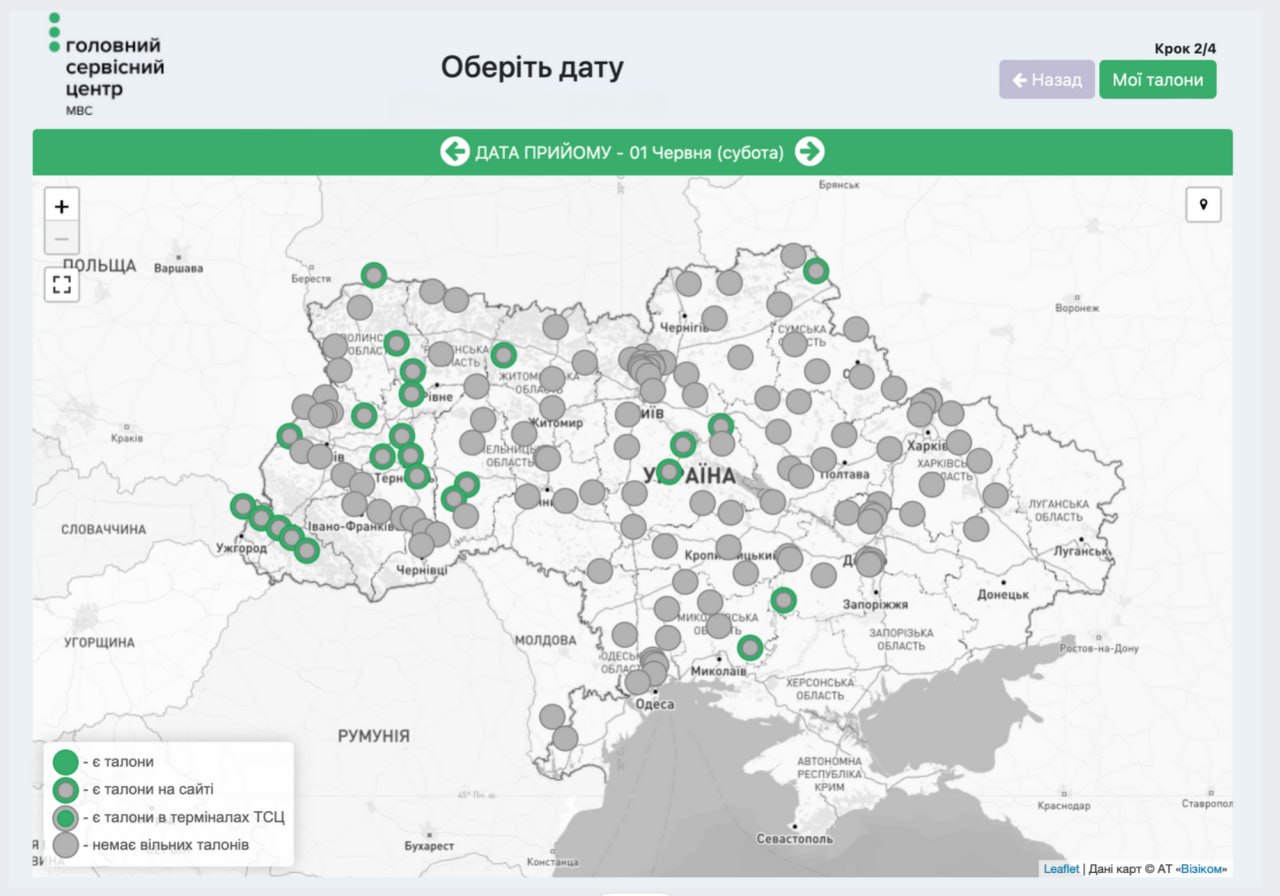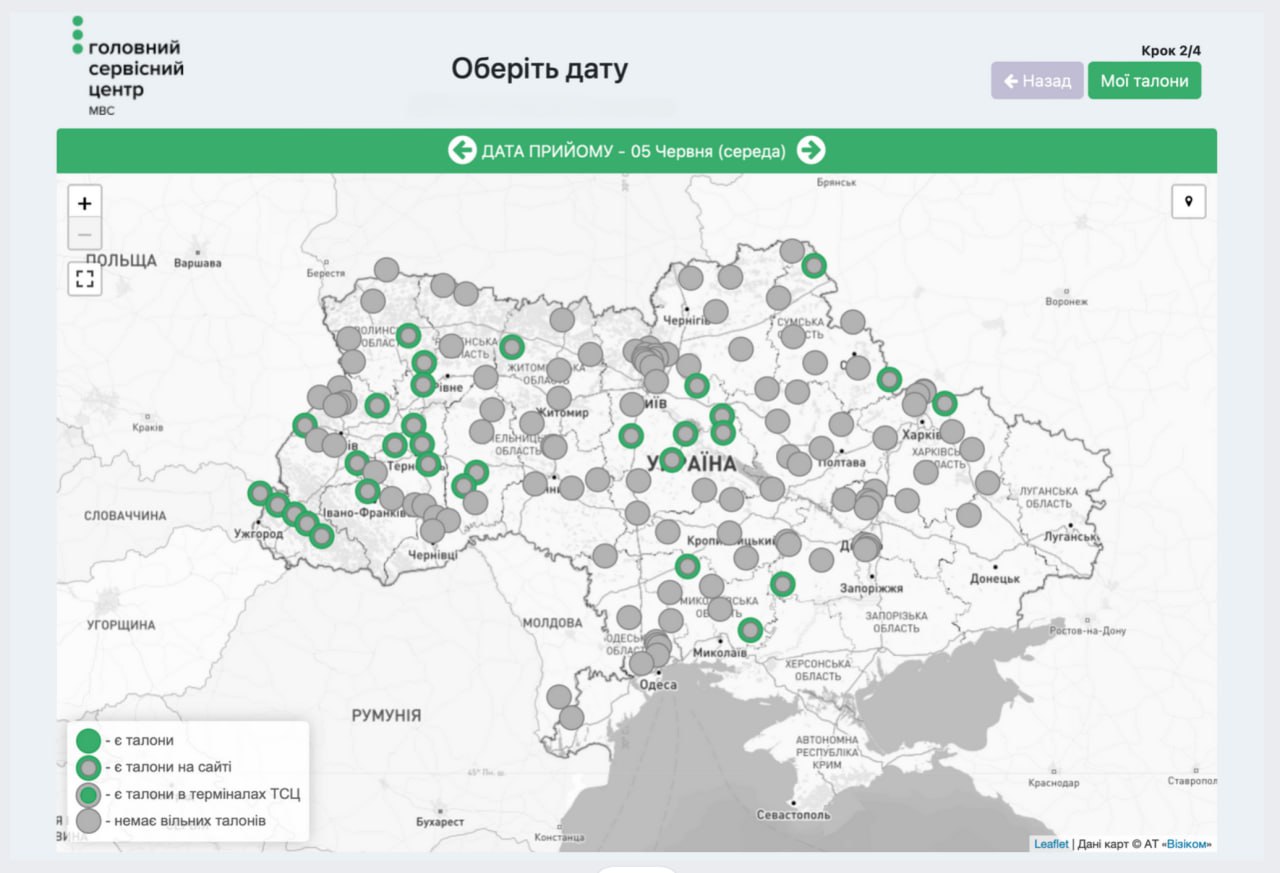 Если смотреть по всей Украине, то даже в июне сервис-центры в подавляющем большинстве помечены серыми кружочками - то есть, талонов на запись там уже нет. "Зеленых" СЦ значительно меньше.