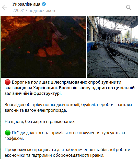 "В результате обстрела повреждены колеи, здания, нерабочие грузовые вагоны и вагон электропоезда. К счастью, без жертв и травмированных. Поезда дальнего и пригородного сообщения курсируют по графику", - говорится в сообщении компании.