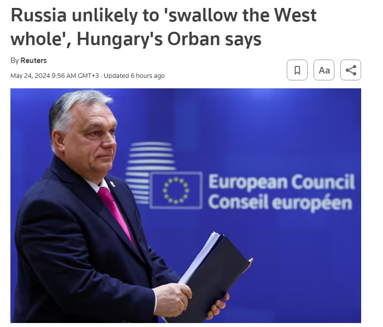 "Российские войска уже показали пределы своих возможностей в Украине. Если бы россияне были достаточно сильны, чтобы победить украинцев одним махом, они бы это уже сделали. Поэтому я не считаю логичным, что Россия, которая не может победить даже Украину, вдруг придёт и проглотит весь западный мир. Шансы на это чрезвычайно малы", – сказал премьер Венгрии.