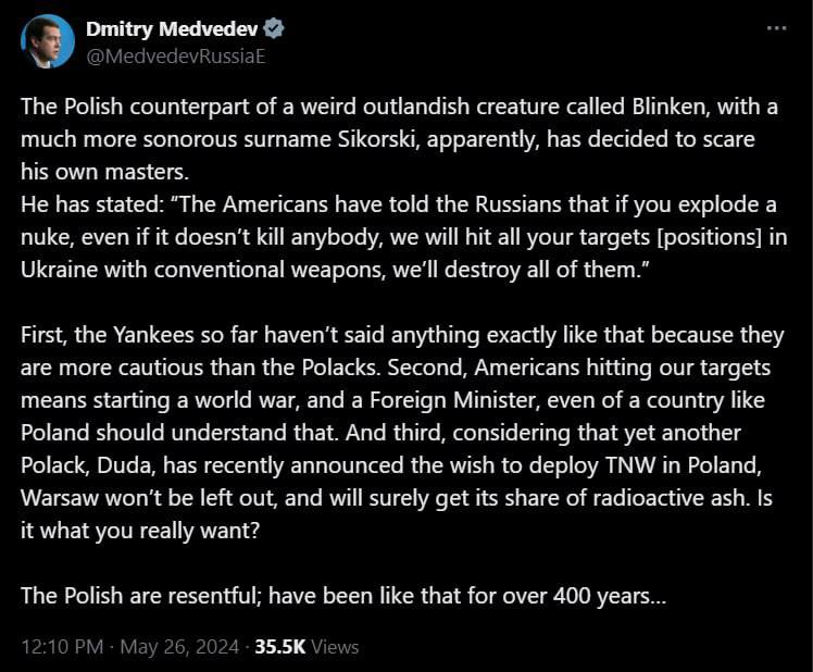 "Во-первых, янки пока ничего подобного не говорили, потому что они более осторожны, чем поляки. Во-вторых, поражение американцами наших целей означает начало мировой войны, и министр иностранных дел, даже такой страны, как Польша, должен это понимать. И в-третьих, учитывая, что о желании разместить ТЯО в Польше недавно заявил еще один поляк Дуда, Варшава не останется в стороне и наверняка получит свою долю радиоактивного пепла", - угрожает Медведев.