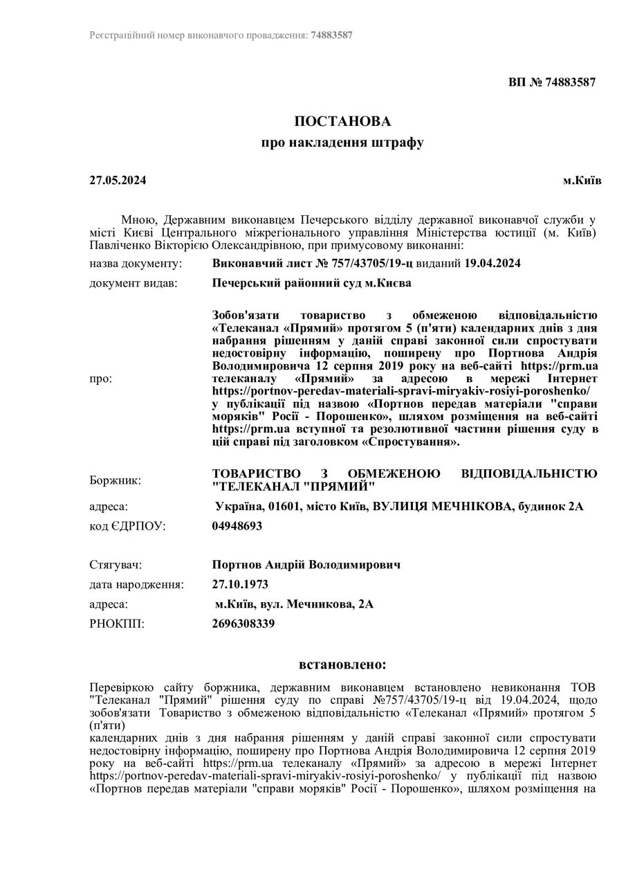 Портнов подал в суд, и все инстанции удовлетворили его иск и признали, что заявление было ложным, и канал должен его опровергнуть. Но это сделано не было. Текущий штраф не отменяет необходимости опубликовать опровержение.