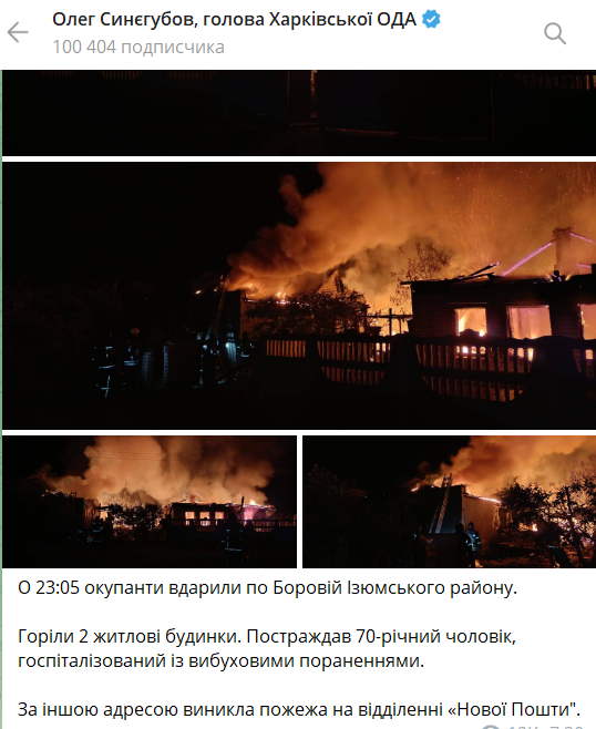"В 23:05 оккупанты ударили по Боровой Изюмского района. Горели два жилых дома. Пострадал 70-летний мужчина, госпитализированный со взрывными ранениями. По другому адресу возник пожар в отделении "Новой Почты", - говорится в сообщении.
