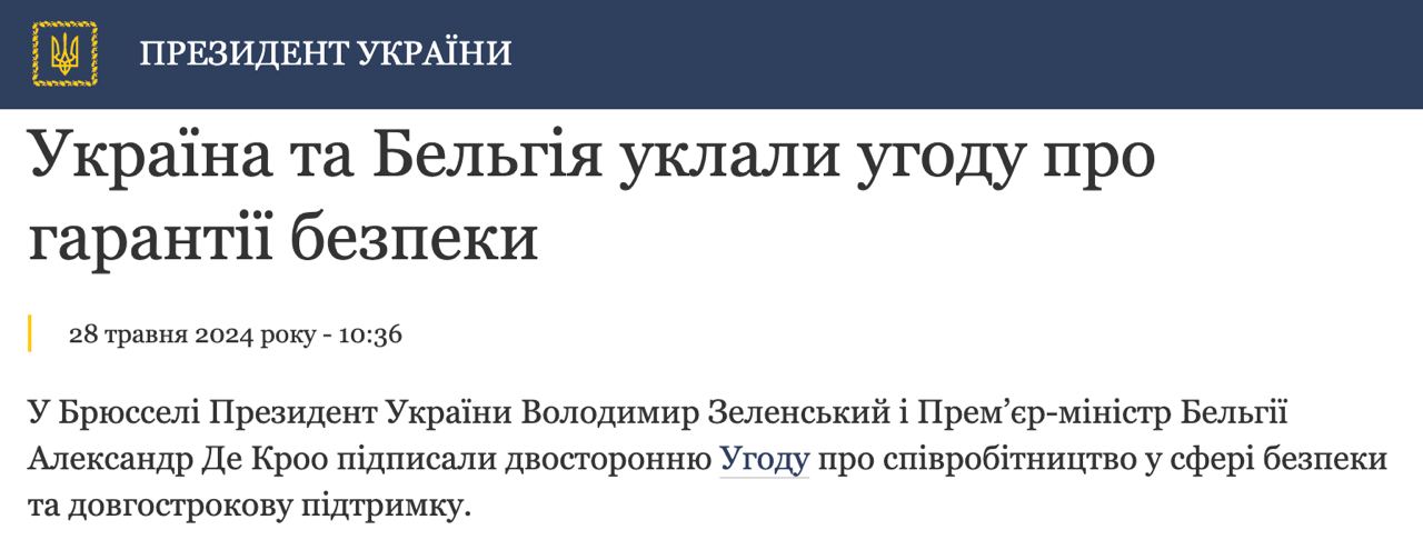 Сегодня, 27 мая, президент Украины Владимир Зеленский в Брюсселе подписал документ с премьером Бельгии Александр Де Кро "соглашение о гарантиях безопасности"