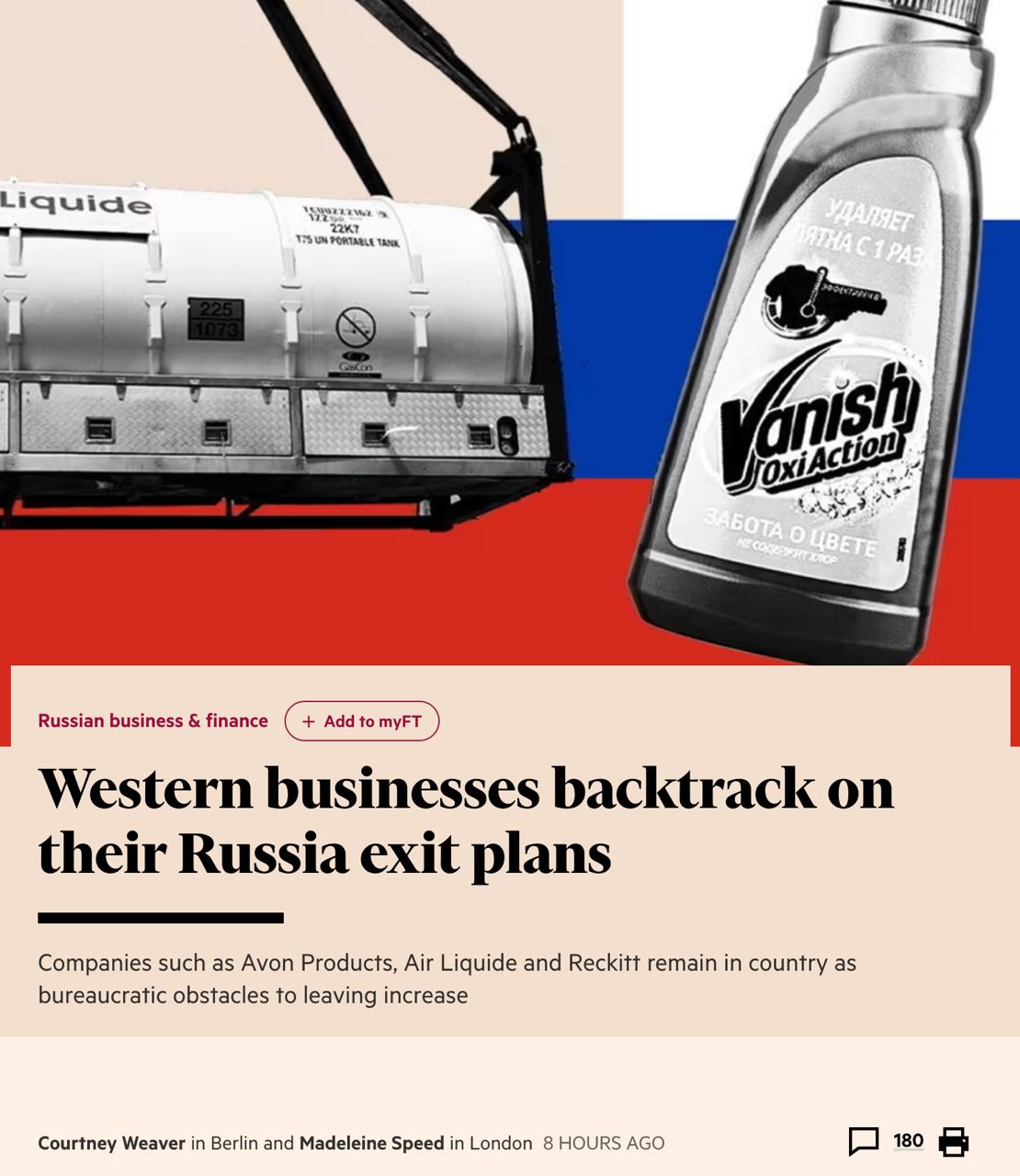 Многие западные компании отказались от планов уйти из России, поскольку "бюрократические препятствия растут, а потребительская активность восстанавливается". В частности, речь идет о компаниях Avon Products, Air Liquide и Reckitt, которые ранее озвучивали планы покинуть РФ.
