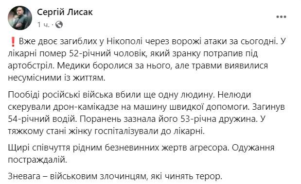 В Никополе Днепропетровской области уже двое погибших в результате сегодняшних обстрелов РФ. Один мужчина умер после утреннего артобстрела. Второй - от удара дрона-камикадзе по машине скорой помощи.