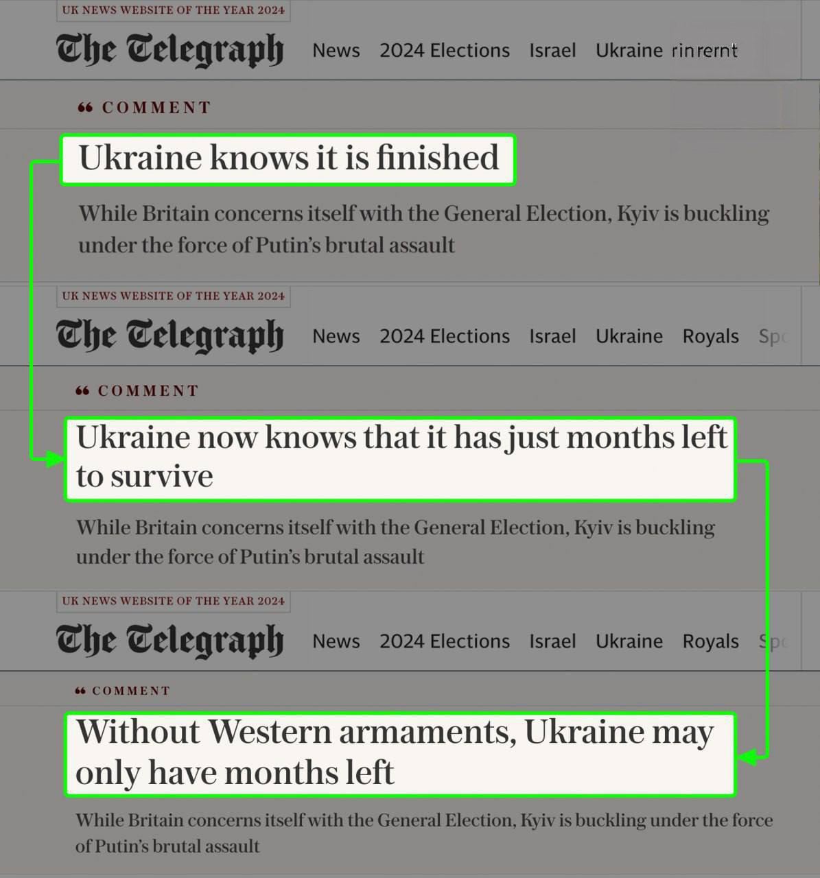 12.50 The Telegraph дважды отредактировал громкий заголовок колонки о тяжелом положении Украины авторства Лизы Хаселдайн.