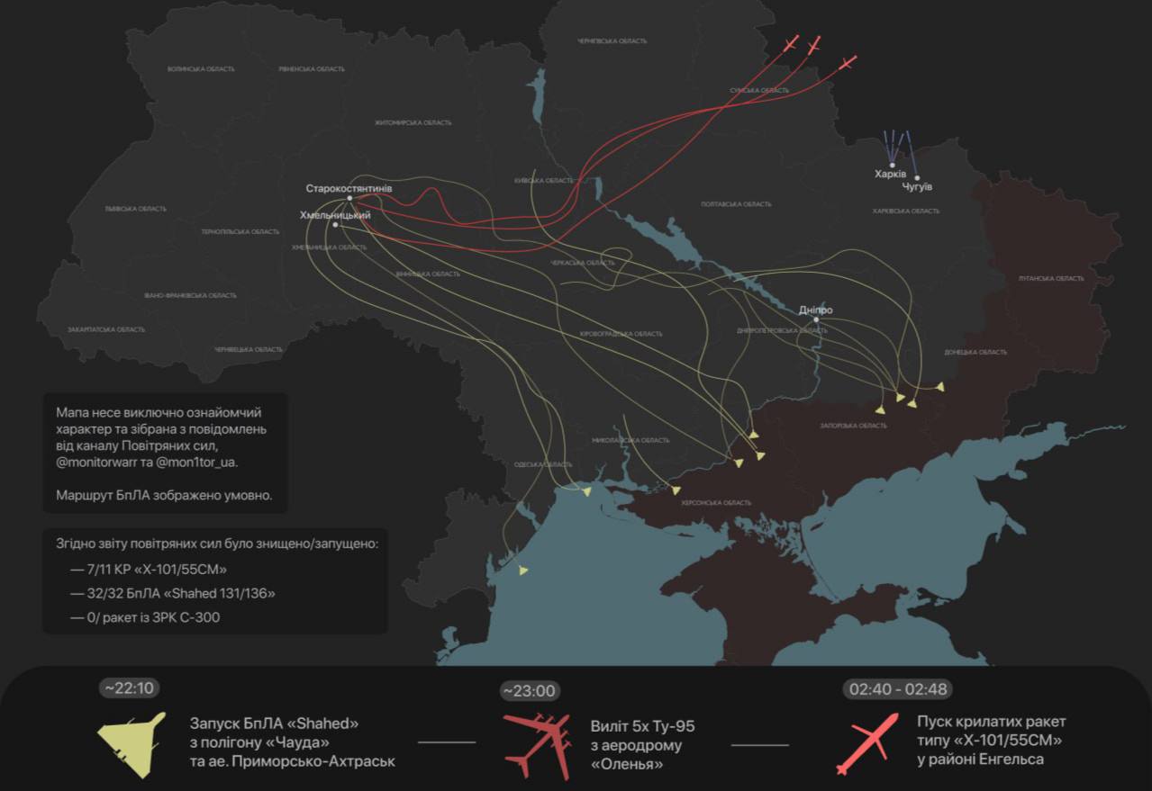 Судя по карте полетов крылатых ракет и "Шахедов", их основной целью этой ночью стал Староконстантинов Хмельницкой области.