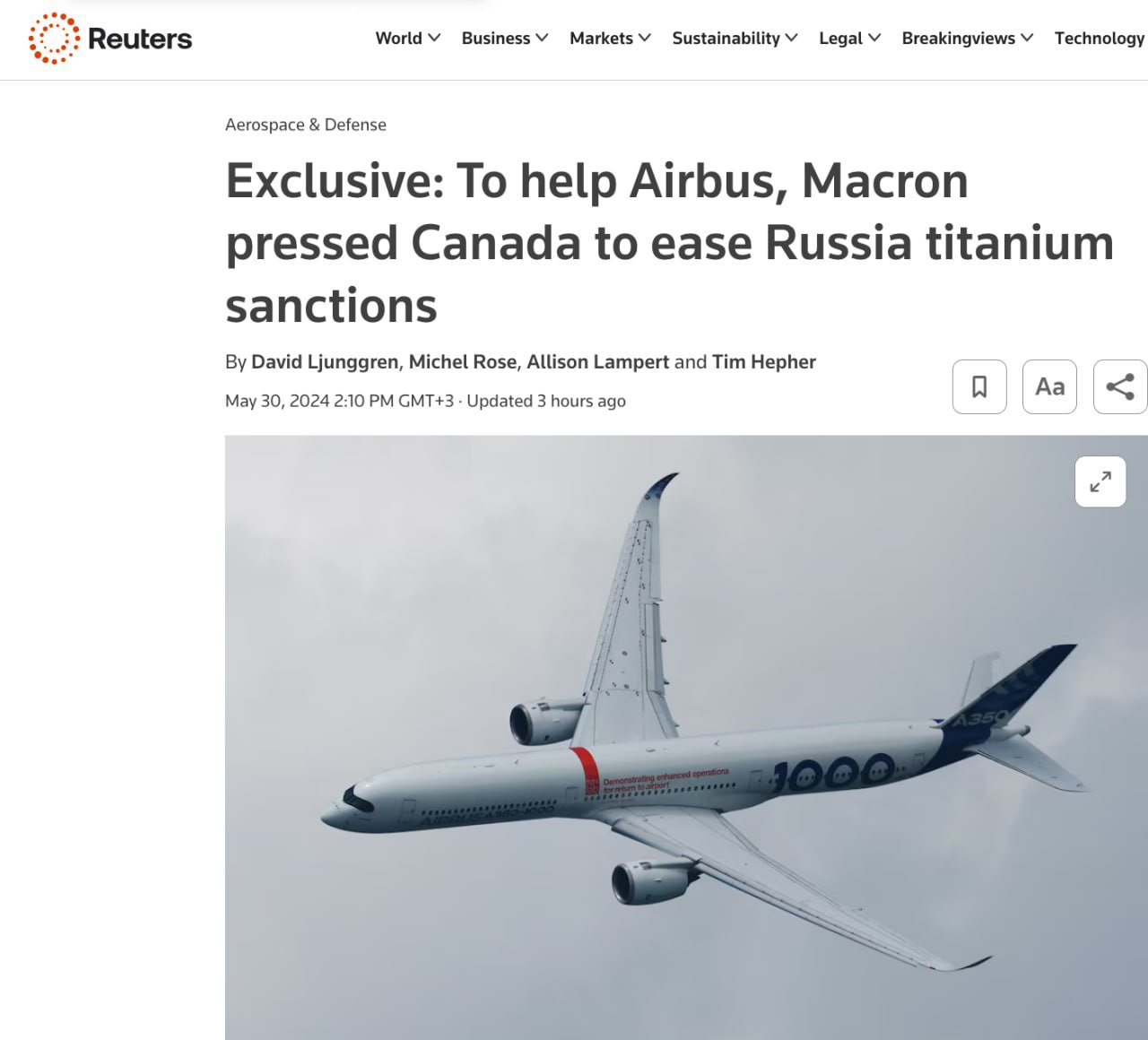 Президент Франции Эммануэль Макрон лично вмешался, чтобы убедить премьер-министра Канады Джастина Трюдо освободить Airbus и другие аэрокосмические компании от санкций, касающихся российского титана.