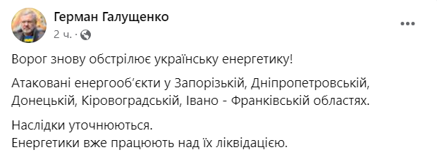 Министр энергетики Герман Галущенко сообщил, что россияне обстреляли украинскую энергетику. Атакованы энергообъекты в Запорожской, Днепропетровской, Донецкой, Кировоградской, Ивано-Франковской областях.