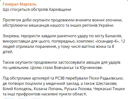 Сегодня утром российские войска ударили по Балаклее Изюмского района. Пострадали 12 человек, среди них восемь детей.