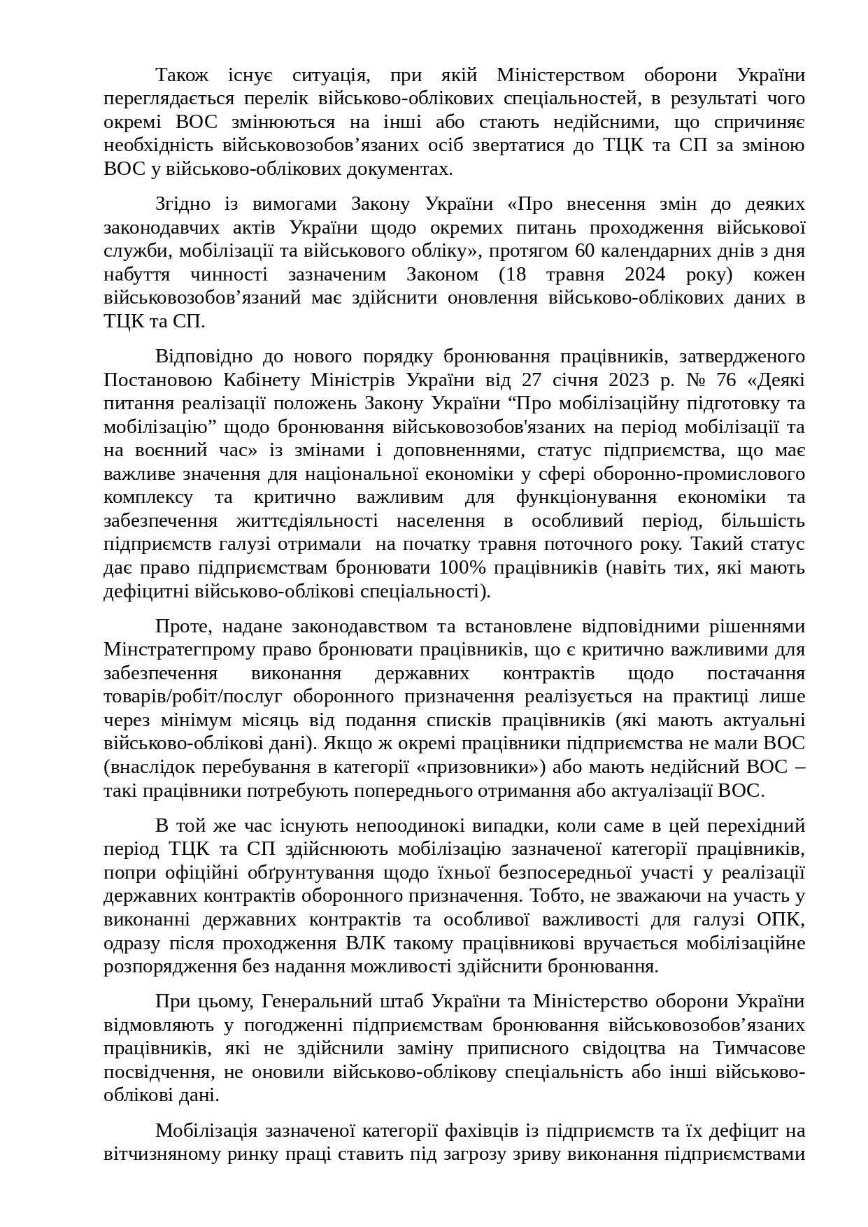 "Нередки случаи, когда именно в этот период ТЦК и СП осуществляют мобилизацию указанной категории работников, хотя имеют официальные доказательства их непосредственного участия в реализации госконтрактов оборонного назначения. Сразу после прохождения ВВК таким работникам вручается мобилизационное распоряжение без возможности осуществить бронирование", - заявляют предприятия.