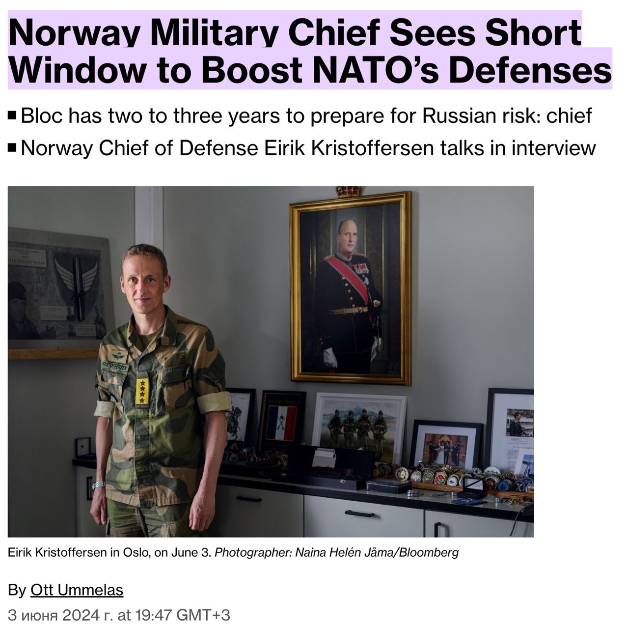 Глава Вооруженных сил Норвегии генерал Эйрик Кристофферсен заявил, что у НАТО есть два-три года, чтобы подготовиться к возможному российскому нападению.