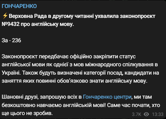 Напомним, в ноябре 2023 года Верховная Рада приняла за основу законопроект о применении английского языка в Украине.